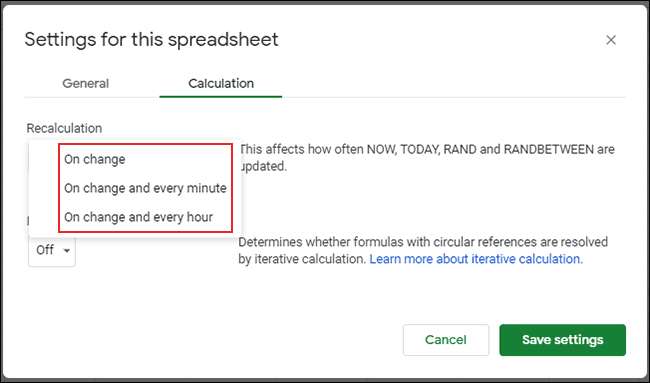 Για να το κάνετε αυτό, εισαγάγετε τις ρυθμίσεις των Υπολογιστικών φύλλων Google (Αρχείο> Ρυθμίσεις υπολογιστικού φύλλου), κάντε κλικ στην καρτέλα "Υπολογισμός" και, στη συνέχεια, επιλέξτε τη συχνότητα ενημέρωσης από το αναπτυσσόμενο μενού "Επανυπολογισμός".