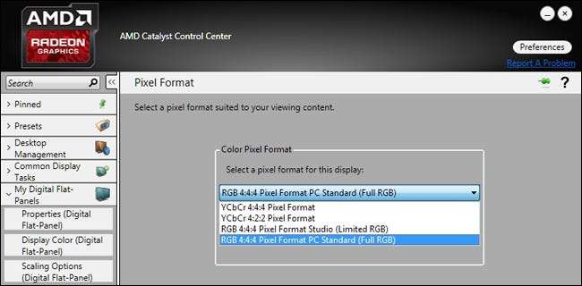 Υπάρχει επίσης μια ξεχωριστή ρύθμιση για κάθε οθόνη που έχετε συνδέσει στον υπολογιστή σας, επομένως ίσως χρειαστεί να την αλλάξετε πολλές φορές εάν έχετε πολλές οθόνες. Απλώς επιλέξτε την οθόνη που θέλετε να διαμορφώσετε στον πίνακα ελέγχου του προγράμματος οδήγησης γραφικών και, στη συνέχεια, αλλάξτε την οθόνη σε RGB Full.