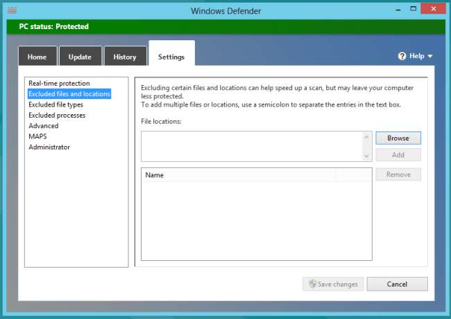 Κάντε κλικ στην καρτέλα Ρυθμίσεις και επιλέξτε το Εξαιρούμενα αρχεία και τοποθεσίες κατηγορία.