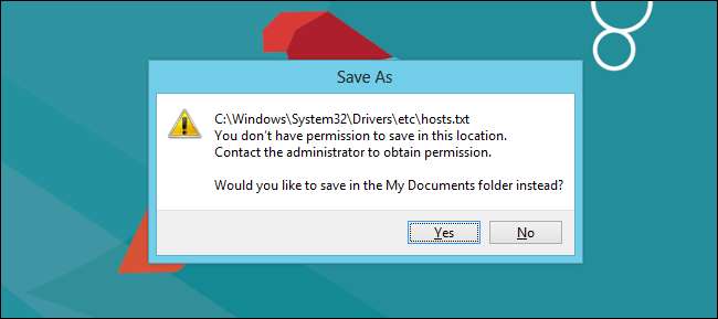 Θα πρέπει να επεξεργαστείτε το αρχείο κεντρικών υπολογιστών ως διαχειριστής. Εάν το ανοίξετε κανονικά και προσπαθείτε να το αποθηκεύσετε, θα δείτε ένα μήνυμα που δηλώνει ότι δεν έχετε άδεια να αποθηκεύσετε ένα αρχείο στην τοποθεσία του.