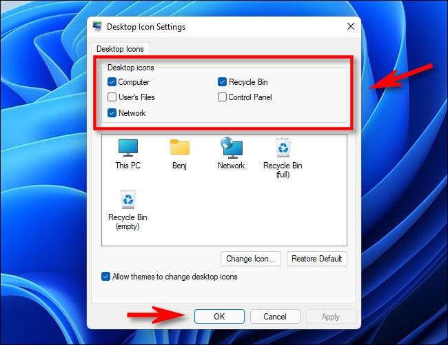 Θα εμφανιστεί ένα ειδικό παράθυρο με τίτλο "Ρυθμίσεις εικονιδίων επιφάνειας εργασίας". Χρησιμοποιώντας την ενότητα "Επιτραπέζια εικονίδια" κοντά στην κορυφή του παραθύρου, τοποθετήστε τα σημάδια ελέγχου δίπλα στα ειδικά εικονίδια που θέλετε να εμφανιστεί στην επιφάνεια εργασίας. Για παράδειγμα, αν θέλετε να δείτε τον κάδο ανακύκλωσης στην επιφάνεια εργασίας σας, ελέγξτε "κάδο ανακύκλωσης". Όταν τελειώσετε, κάντε κλικ στο "OK".