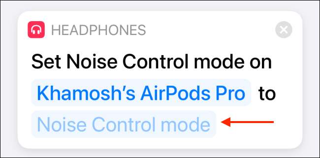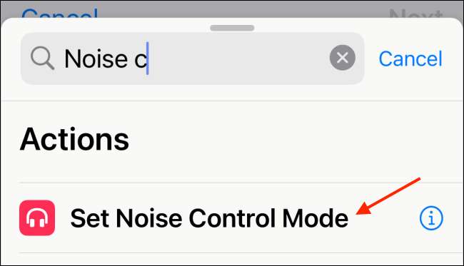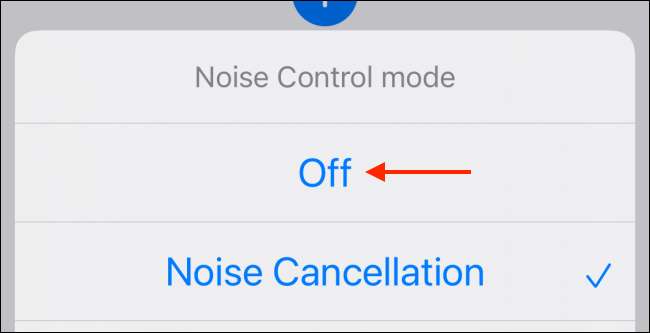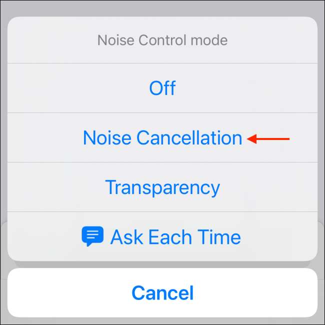 Εδώ, μπορείτε να επιλέξετε το Off, θορύβου ακύρωσης, διαφάνεια, ή ζητήστε από κάθε επιλογή χρόνου. Καθώς δημιουργείτε μια συντόμευση για την ενεργοποίηση λειτουργία ακύρωσης θορύβου, επιλέξτε την επιλογή «Ακύρωση θορύβου».