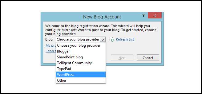 Το Word υποστηρίζει έναν εκπληκτικό αριθμό πλατφορμών έξω από το κουτί. Το How-To Geek εκτελείται στο WordPress, οπότε θα το επιλέξουμε, αλλά μη διστάσετε να επιλέξετε την πλατφόρμα στην οποία εκτελείται το ιστολόγιό σας και, στη συνέχεια, κάντε κλικ στο επόμενο.