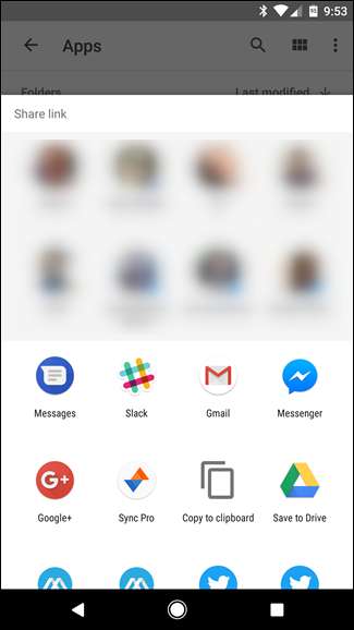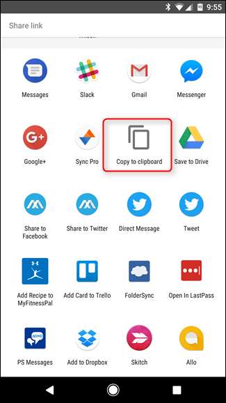 Το πλαίσιο διαλόγου "Κοινή χρήση" θα φαίνεται πιθανότατα διαφορετικό από το δικό μου, επειδή έχει επιμεληθεί με βάση το ιστορικό κοινής χρήσης, τις εγκατεστημένες εφαρμογές και ούτω καθεξής. Ωστόσο, θα πρέπει να μπορείτε να το κάνετε από εδώ - απλώς επιλέξτε την εφαρμογή στην οποία θέλετε να μοιραστείτε το αρχείο. Εναλλακτικά, μπορείτε να επιλέξετε την επιλογή "Αντιγραφή στο πρόχειρο" εάν προτιμάτε απλώς να αντιγράψετε τον σύνδεσμο και να τον μοιραστείτε χειροκίνητα.