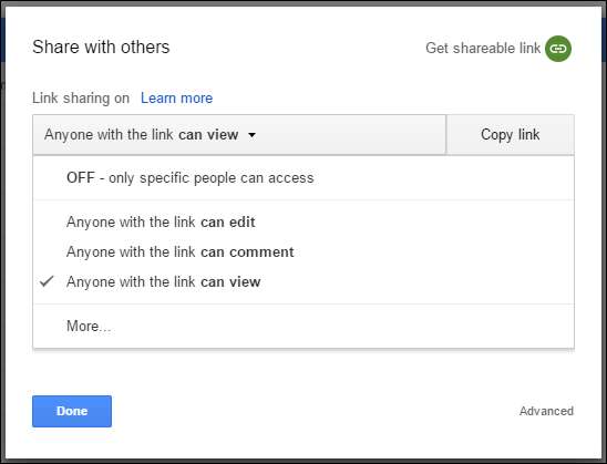 Αλλά υπάρχει ακόμα περισσότερος έλεγχος εδώ. Όταν δημιουργείτε έναν σύνδεσμο λήψης, επιτρέπει αυτόματα την προβολή του αρχείου από οποιονδήποτε διαθέτει τον σύνδεσμο. Μπορείτε, ωστόσο, να αλλάξετε αυτήν τη ρύθμιση χρησιμοποιώντας το αναπτυσσόμενο μενού ακριβώς πάνω από τον σύνδεσμο.