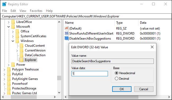 Ονομάστε την τιμή "DisableSearchBoxSuggestions". Κάντε διπλό κλικ σε αυτό και ορίστε τα δεδομένα τιμής σε "1".