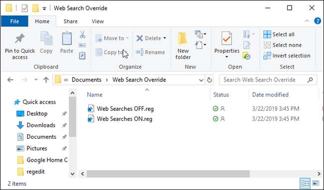 Εάν δεν αισθάνεστε άνετα να κάνετε αλλαγές στο Μητρώο, δημιουργήσαμε δύο αρχεία με δυνατότητα λήψης που μπορείτε να χρησιμοποιήσετε. Ένα αρχείο απενεργοποιεί την αναζήτηση ιστού από το μενού Έναρξη και το άλλο αρχείο θα ενεργοποιήσει εκ νέου τις αναζητήσεις ιστού. Και τα δύο περιλαμβάνονται στο ακόλουθο αρχείο zip, και το καθένα λειτουργεί απλώς αλλάζοντας τις τιμές που αποδείξαμε πώς να αλλάξουμε παραπάνω. Κάντε διπλό κλικ σε αυτό που θέλετε και κάντε κλικ στις οδηγίες.