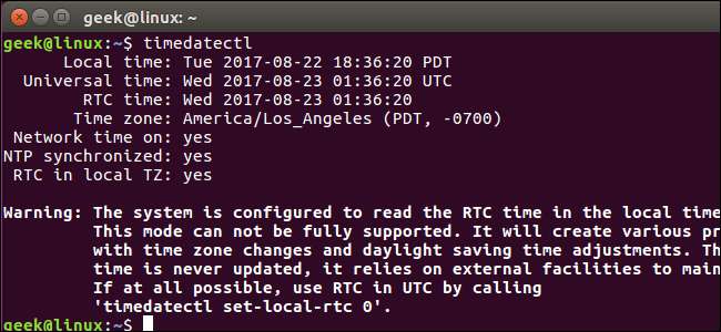 Εάν δείτε "RTC στο τοπικό TZ: ναι", το Linux έχει ρυθμιστεί να χρησιμοποιεί την τοπική ζώνη ώρας αντί για UTC. Η εντολή σάς προειδοποιεί ότι αυτή η λειτουργία δεν υποστηρίζεται πλήρως και μπορεί να προκαλέσει ορισμένα προβλήματα κατά την αλλαγή μεταξύ των ζωνών ώρας και της θερινής ώρας. Ωστόσο, αυτή η λειτουργία υποστηρίζεται πιθανώς καλύτερα από την επιλογή UTC στα Windows. Εάν κάνετε διπλή εκκίνηση με Windows, τα Windows θα διαχειρίζονται τη θερινή ώρα για εσάς.