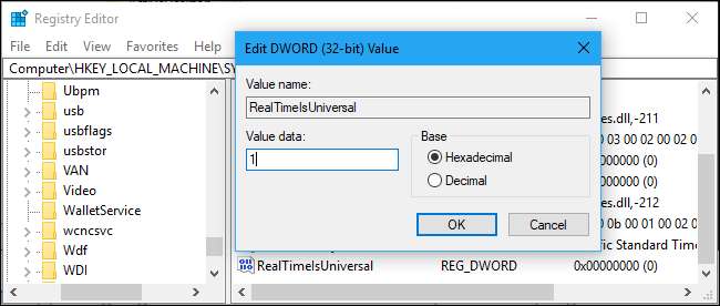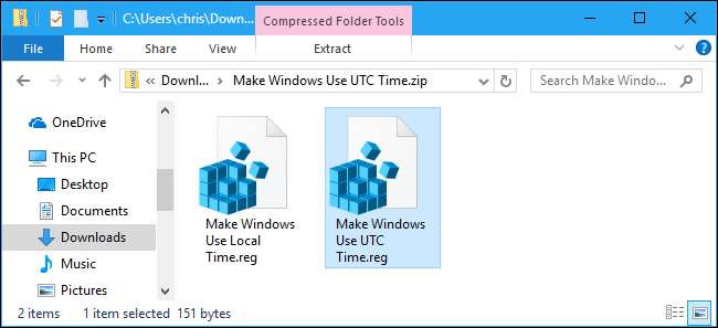 Εάν δεν θέλετε να επεξεργαστείτε μόνοι σας το μητρώο, μπορείτε να χρησιμοποιήσετε την καταγραφή μητρώου με δυνατότητα λήψης. Δημιουργήσαμε ένα hack που κάνει τα Windows να χρησιμοποιούν την ώρα UTC και ένα που το επαναφέρει στην τοπική ώρα. Και τα δύο περιλαμβάνονται στο ακόλουθο αρχείο ZIP. Απλώς κατεβάστε το αρχείο, κάντε διπλό κλικ στο hack που θέλετε να χρησιμοποιήσετε και συμφωνήστε να προσθέσετε τις πληροφορίες στο μητρώο σας.