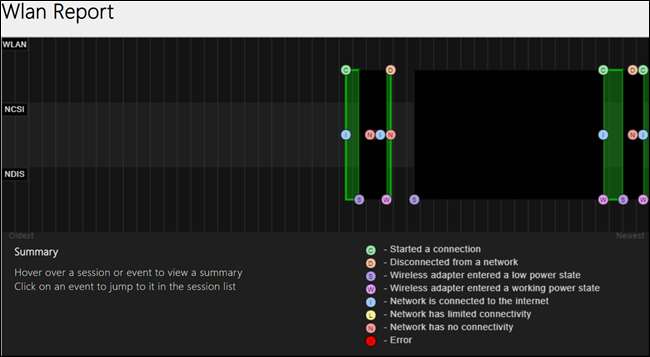 Η πρώτη ενότητα δείχνει ένα γράφημα με αναφορά WLAN που, όταν τοποθετείτε το ποντίκι σας πάνω από μια συγκεκριμένη περίοδο λειτουργίας, εμφανίζει λεπτομερείς πληροφορίες για κάθε συνεδρία. Ένας κόκκινος κύκλος με το "X" αντιπροσωπεύει ένα σφάλμα. Αυτό είναι ένα διαδραστικό γράφημα και μπορείτε να τοποθετήσετε το δείκτη του ποντικιού πάνω από ένα συμβάν για να λάβετε μια σύνοψη ή να κάνετε κλικ σε οποιοδήποτε συμβάν για να μεταβείτε σε αυτό στη λίστα συνεδριών πιο κάτω στην αναφορά.