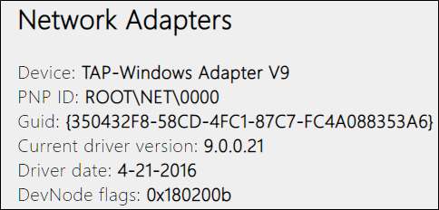 Αυτή η ενότητα περιέχει μια λεπτομερή λίστα με όλους τους προσαρμογείς δικτύου στον υπολογιστή σας, συμπεριλαμβανομένων τυχόν κρυφών. Δίνει το όνομα της συσκευής, το Αναγνωριστικό Plug and Play, το Global Unique Identifier, το τρέχον πρόγραμμα οδήγησης, την ημερομηνία του προγράμματος οδήγησης και τις σημαίες κόμβου συσκευής