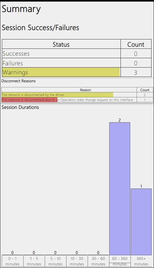 Η ενότητα περίληψης χωρίζεται σε τρία μέρη και δείχνει επιτυχίες, αποτυχίες και προειδοποιήσεις συνεδρίας. λόγοι αποσύνδεσης και τη διάρκεια κάθε συνεδρίας.