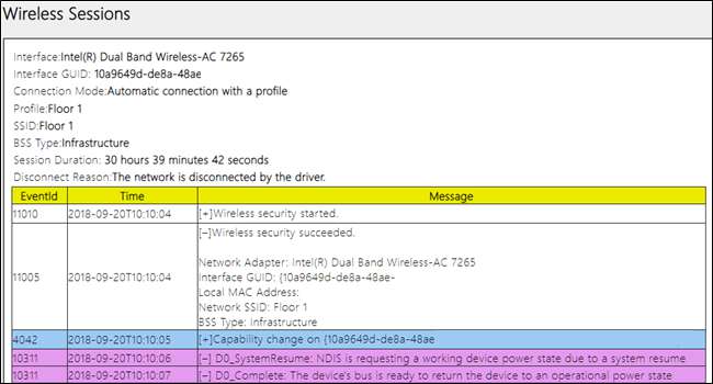 Σε αυτήν την ενότητα, θα βρείτε μια πολύ λεπτομερή λίστα με όλα τα συμβάντα που συνέβησαν για κάθε συνεδρία Wi-Fi. Κάθε συνεδρία χωρίζεται στο δικό της τμήμα. Κάνοντας κλικ στο συν για επέκταση ενός συμβάντος αποκαλύπτονται ακόμη περισσότερες λεπτομέρειες σχετικά με αυτό. Ορισμένες από τις λεπτομέρειες περιλαμβάνουν όνομα διασύνδεσης, λειτουργία σύνδεσης, προφίλ σύνδεσης, όνομα δικτύου και αιτία αποσύνδεσης.