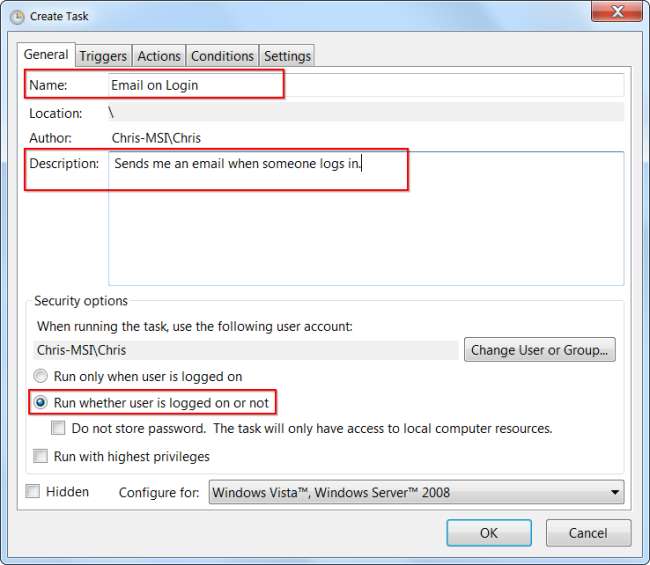 Στο παράθυρο Γενικά, δώστε ένα όνομα και περιγραφή για την εργασία. Πρέπει επίσης να επιλέξετε το Εκτελέστε αν ο χρήστης είναι συνδεδεμένος ή όχι επιλογή.