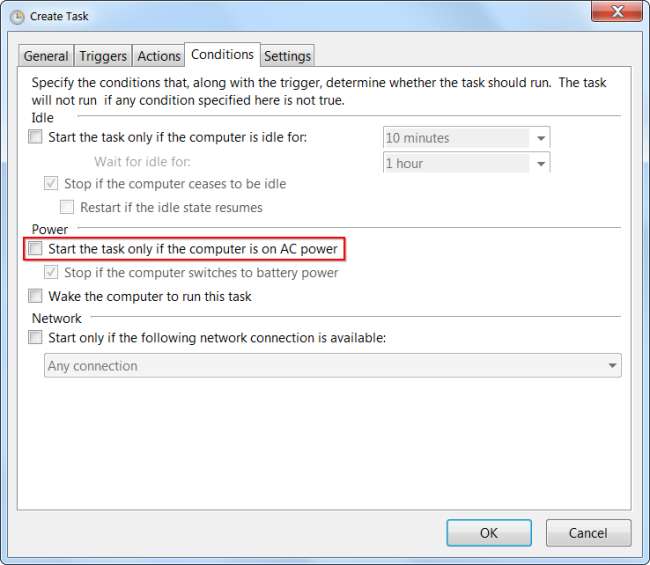 Στην καρτέλα Συνθήκες, καταργήστε την επιλογή Ξεκινήστε την εργασία μόνο εάν ο υπολογιστής βρίσκεται σε τροφοδοσία AC επιλογή ή δεν θα λάβετε μηνύματα ηλεκτρονικού ταχυδρομείου εάν ο υπολογιστής σας είναι φορητός υπολογιστής και είναι αποσυνδεδεμένος.