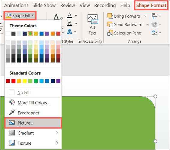 Επιλέξτε το σχήμα και μεταβείτε στην καρτέλα Μορφή σχήματος που εμφανίζεται. Κάντε κλικ στην επιλογή "Σχήμα πλήρωσης" στο τμήμα μορφών σχήματος της κορδέλας και επιλέξτε "εικόνα".