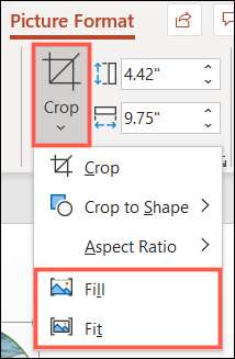 Κάντε κλικ στην εικόνα μέσα στο σχήμα και μεταβείτε στην καρτέλα Μορφοποίηση εικόνας που εμφανίζεται. Στη συνέχεια, κάντε κλικ στο βέλος κάτω από το "Crop" στο τμήμα μεγέθους της κορδέλας και επιλέξτε είτε "γεμίστε" είτε "FIT".