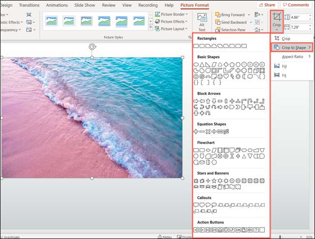 Επιλέξτε την εικόνα και μεταβείτε στην καρτέλα Μορφοποίηση εικόνας. Κάντε κλικ στο βέλος κάτω από το "Crop" στο τμήμα μεγέθους της κορδέλας και επιλέξτε "καλλιέργεια σε σχήμα". Επιλέξτε το σχήμα που θέλετε να χρησιμοποιήσετε στο μενού POP-OUT.