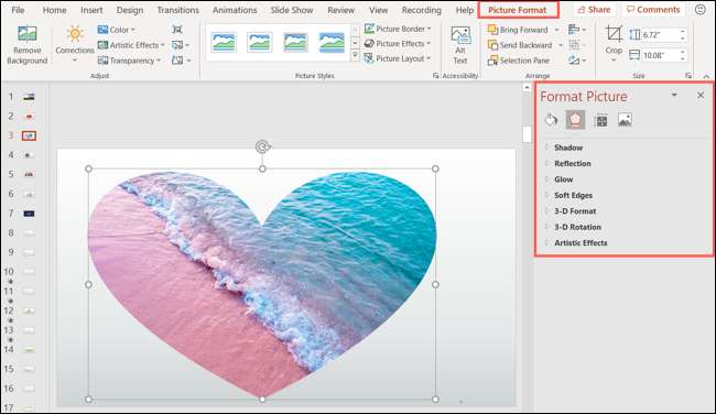 Στη συνέχεια, μπορείτε να επιλέξετε την εικόνα και να χρησιμοποιήσετε τα εργαλεία στην καρτέλα μορφής εικόνας ή μπορείτε να κάνετε δεξί κλικ για να ανοίξετε την πλευρική γραμμή εικόνας για να προσθέσετε κάποια pizzazz.