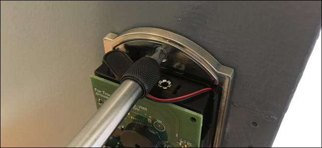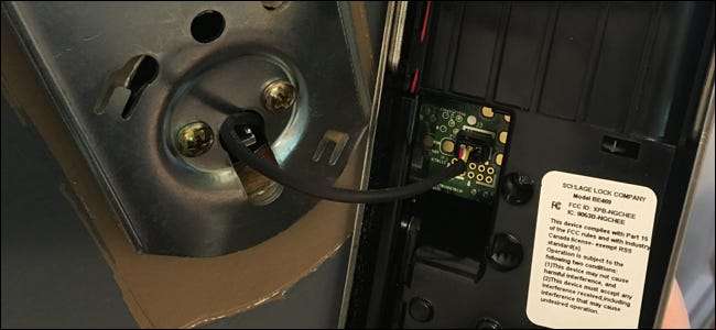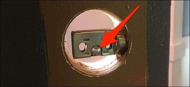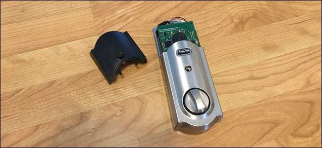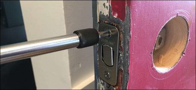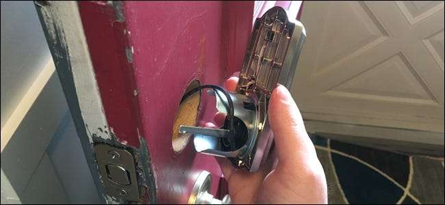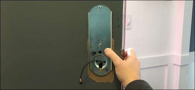 Ξεκινήστε αφαιρώντας το deadbolt που είναι επί του παρόντος εγκατεστημένο στην πόρτα σας, το οποίο συνήθως περιλαμβάνει την αφαίρεση μερικών βιδών από το εσωτερικό. Το deadbolt μου είναι της ποικιλίας πληκτρολογίου με μπαταρία, οπότε είναι λίγο πιο περίπλοκο να το αφαιρέσετε. Εάν έχετε απλώς ένα απλό deadbolt, αυτή η διαδικασία θα πρέπει να είναι πολύ πιο εύκολη για εσάς.