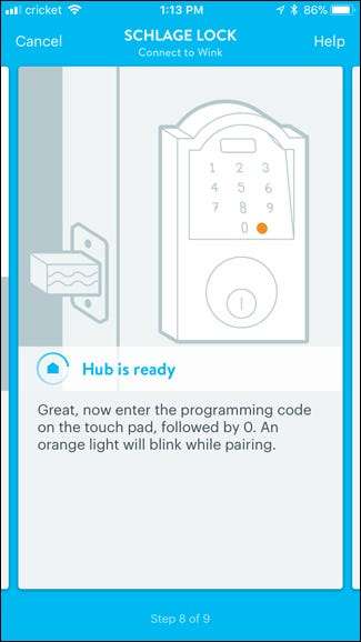 Στη συνέχεια, ανοίξτε την πόρτα σας, επεκτείνετε το αδιέξοδο έτσι ώστε να βρίσκεται στην κλειδωμένη θέση και, στη συνέχεια, πατήστε το κουμπί Schlage ακολουθούμενο από τον κωδικό προγραμματισμού σας συν "0". Η πορτοκαλί κουκκίδα θα αναβοσβήνει και μετά από λίγα δευτερόλεπτα θα ανάψει το πράσινο σημάδι επιλογής, το οποίο δείχνει ότι η σύνδεση ήταν επιτυχής.