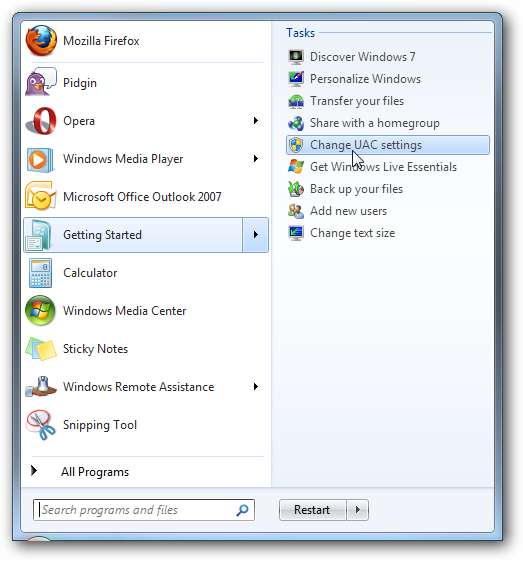 Για να διαχειριστείτε τις ρυθμίσεις ειδοποιήσεων UAC μεταβείτε στο Έναρξη \ Ξεκινώντας \ Αλλαγή ρυθμίσεων UAC.