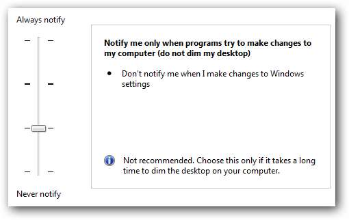 Από προεπιλογή, είναι ρυθμισμένο να σας ειδοποιεί όταν τα προγράμματα προσπαθούν να κάνουν αλλαγές στον υπολογιστή, η οποία είναι ήδη μια λιγότερο ενοχλητική ρύθμιση που ήταν το Vista. Μπορείτε να προσαρμόσετε το επίπεδο σε αυτό που σας ταιριάζει περισσότερο και να το απενεργοποιήσετε τελείως, σύρετε το προς τα κάτω για να μην ειδοποιηθεί ποτέ