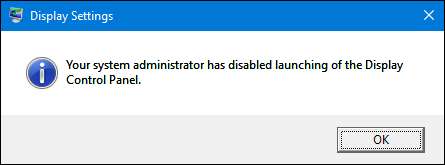 Τώρα μπορείτε να κλείσετε τον Επεξεργαστή Μητρώου. Οι αλλαγές θα πραγματοποιηθούν αμέσως, οπότε αν προσπαθήσετε να ανοίξετε τις ρυθμίσεις της προφύλαξης οθόνης, θα εμφανιστεί ένα μήνυμα σφάλματος. Και μην ανησυχείτε. Ενώ το μήνυμα σφάλματος υπονοεί ότι ολόκληρος ο πίνακας ελέγχου οθόνης έχει απενεργοποιηθεί, το μόνο πράγμα που έχουμε απενεργοποιήσει εδώ είναι η δυνατότητα αλλαγής της προφύλαξης οθόνης.