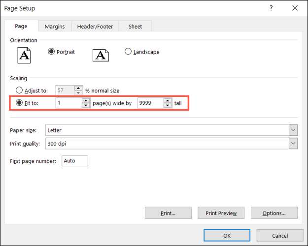 Υπόδειξη: Εάν το φύλλο σας είναι ευρύτερο από ό, τι είναι μακρύ, σκεφτείτε να αλλάξετε τον προσανατολισμό στο παράθυρο ρύθμισης σελίδας στο τοπίο για να φιλοξενήσετε το πλάτος.