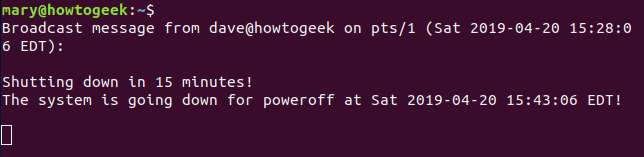 ορισμένες παράμετροι, όπως μια συμβολοσειρά χρόνου και ένα μήνυμα που θα σταλεί στους συνδεδεμένους χρήστες για να τους προειδοποιήσουν για το κλείσιμο. Ας προγραμματίσουμε ένα κλείσιμο για 15 λεπτά από τώρα. Τύπος