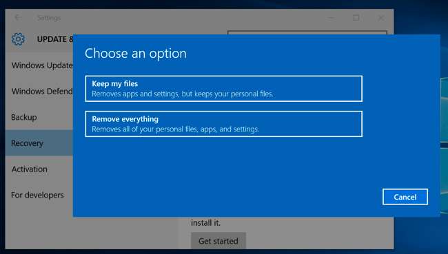 Εάν αποτύχουν όλα τα άλλα, θα μπορούσατε πάντα να καταφύγετε σε επαναφορά συστήματος ή επανεγκατάσταση των Windows. Στα Windows 8 και 10, μπορείτε να εκτελέσετε ένα " Επαναφέρετε αυτόν τον υπολογιστή Λειτουργία για επαναφορά των Windows στην προεπιλεγμένη κατάσταση. Θα έχετε την επιλογή να διατηρήσετε τα προσωπικά σας αρχεία στη θέση τους - αν και θα πρέπει να επανεγκαταστήσετε προγράμματα ή να καταργήσετε τα πάντα και να κάνετε μια πλήρη επανεγκατάσταση. Ό, τι κι αν επιλέξετε, βεβαιωθείτε ότι έχετε δημιουργήθηκε αντίγραφο ασφαλείας του υπολογιστή σας πρώτα! Στα Windows 7 και παλαιότερα, αυτό απαιτεί τη χρήση του διαμερίσματος ανάκτησης που παρέχεται από τον κατασκευαστή του υπολογιστή σας ή την επανεγκατάσταση των Windows από το μηδέν.