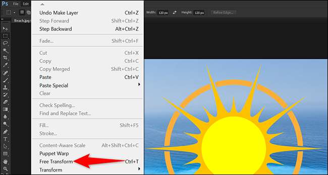 Μετά την επιλογή του στρώματος να αλλάξετε το μέγεθος κλικ Επεξεργασία & gt? Ελεύθερος μετασχηματισμός στη γραμμή μενού του Photoshop.