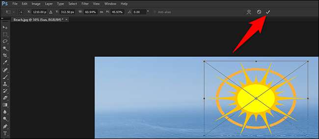 Μέγεθος στρώμα σας θα αλλάξει σε πραγματικό χρόνο στο Photoshop. Σύρετε το στρώμα για να το επανατοποθετήσει στη φωτογραφία σας, αν θέλετε. Στη συνέχεια, στην κορυφή της διεπαφής Photoshop, κάντε κλικ στο εικονίδιο σημάδι.