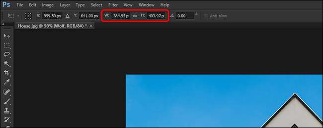 Στην κορυφή της διεπαφής Photoshop, έχετε διάφορες πλαίσια κειμένου. Εδώ, κάντε κλικ στο «W» παράθυρο και πληκτρολογήστε το νέο πλάτος στρώμα σας που ακολουθείται από «px» (χωρίς εισαγωγικά). Στη συνέχεια, κάντε κλικ στο «H» παράθυρο και πληκτρολογήστε το νέο ύψος για το στρώμα σας, ακολουθούμενο από το «px» (χωρίς εισαγωγικά).