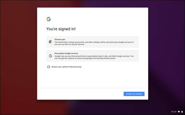Το Chromebook θα διαρκέσει λίγα δευτερόλεπτα για να προετοιμάσει τα πάντα (και μπορεί να εμφανίσει μια προειδοποίηση εάν έχετε ενεργοποιήσει τη Λειτουργία επισκέπτη), αλλά μετά από αυτό, μπορείτε να πάτε. Κάντε κλικ στο κουμπί "Αποδοχή και συνέχεια" για να προχωρήσετε.