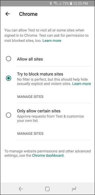 Η πρώτη ενότητα που θέλετε να εξερευνήσετε είναι τα Φίλτρα στο Google Chrome - αυτό είναι αναμφισβήτητα το μεγαλύτερο φίλτρο που θα χρησιμοποιήσετε στο Chrome OS. Από προεπιλογή, τα φίλτρα Chrome έχουν οριστεί σε "Προσπαθήστε να αποκλείσετε ιστότοπους για ενηλίκους", σημειώνοντας ότι κανένα φίλτρο δεν είναι τέλειο. Αλλά στις δοκιμές μας, έκανε αρκετά καλή δουλειά στο να αποκλείσει τους πιο συνηθισμένους ιστότοπους στους οποίους δεν θέλετε να έχει πρόσβαση το παιδί σας. Μπορείτε να το αλλάξετε αυτό που κρίνετε κατάλληλο και ακόμη και να επιτρέψετε σε συγκεκριμένους ιστότοπους να περάσουν από το φίλτρο, κάτι που είναι ιδανικό για την περίπτωση ψευδών θετικών.