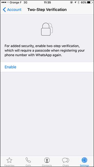Εάν χρησιμοποιείτε την πιο πρόσφατη έκδοση του WhatsApp, θα δείτε μια επιλογή επαλήθευσης σε δύο βήματα. Εάν δεν το βλέπετε, ενημερώστε την εφαρμογή σας. Διαφορετικά, πατήστε Επαλήθευση σε δύο βήματα και, στη συνέχεια, Ενεργοποίηση.