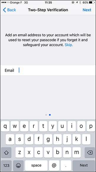 Στη συνέχεια, εισαγάγετε και επιβεβαιώστε τη διεύθυνση email σας. Υπάρχει η επιλογή να παραλείψετε αυτό το βήμα, αλλά δεν το προτείνουμε. Χωρίς μια διεύθυνση email στο λογαριασμό σας WhatsApp, δεν θα μπορείτε να επαναφέρετε τον κωδικό πρόσβασής σας.