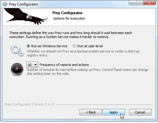 Μόλις συνδεθείτε, το Prey θα ενεργοποιηθεί αμέσως. Το Prey λειτουργεί ως υπηρεσία Windows από προεπιλογή. Εάν θέλετε να τη διαμορφώσετε, μπορείτε να ανοίξετε τη συντόμευση Configure Prey στο φάκελο Prey στην ομάδα προγραμμάτων του μενού Έναρξη.