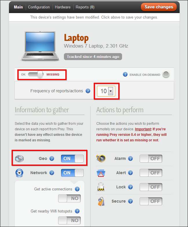 Εάν χάσετε τον φορητό υπολογιστή σας, θα πρέπει να κάνετε κλικ στο όνομά του στον πίνακα ελέγχου Prey και να ρυθμίσετε το ρυθμιστικό από "OK" σε "Λείπει". Το Prey παρακολουθεί τη συσκευή σας μόνο όταν λείπει, επομένως δεν παρακολουθεί συνεχώς την τοποθεσία του φορητού σας υπολογιστή. Φροντίστε επίσης να ενεργοποιήσετε τη λειτουργία Geo, η οποία χρησιμοποιεί το εσωτερικό υλικό GPS του φορητού υπολογιστή σας ή τα ονόματα των κοντινών σημείων πρόσβασης Wi-Fi για να αναφέρετε την τοποθεσία του.