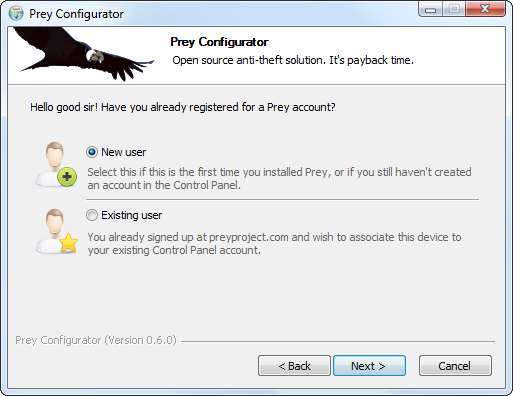 Μετά την εγκατάσταση του Prey, θα σας ζητηθεί να δημιουργήσετε έναν νέο λογαριασμό χρήστη ή να εισαγάγετε τα στοιχεία του τρέχοντος λογαριασμού χρήστη σας.