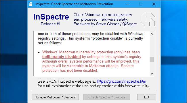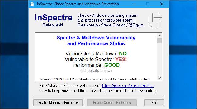 Μπορείτε να απενεργοποιήσετε την προστασία Meltdown ή Specter με το InSpectre εργαλείο που αναφέραμε παραπάνω. Για να απενεργοποιήσετε την προστασία Meltdown ή Specter, κάντε δεξί κλικ στο αρχείο InSpectre.exe και, στη συνέχεια, επιλέξτε "Εκτέλεση ως διαχειριστής". Στη συνέχεια, μπορείτε να κάνετε κλικ στα κουμπιά "Απενεργοποίηση προστασίας από κατάρρευση" και "Απενεργοποίηση προστασίας από φάσμα" για να ενεργοποιήσετε ή να απενεργοποιήσετε την προστασία. Επανεκκινήστε τον υπολογιστή σας αφού πραγματοποιήσετε αυτήν την αλλαγή. Εάν επανεκκινήσετε το εργαλείο InSpectre και μετακινηθείτε στο κείμενο στο πλαίσιο, θα δείτε μια κουκκίδα που σας λέει ότι η προστασία έχει απενεργοποιηθεί στο μητρώο. Μπορείτε να χρησιμοποιήσετε τα ίδια κουμπιά για να ενεργοποιήσετε ξανά την προστασία στο μέλλον, εάν αλλάξετε γνώμη.