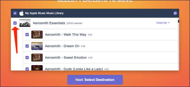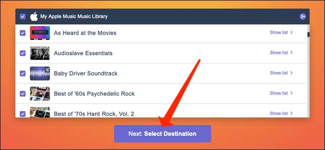 Όταν τελειώσετε την επιλογή των λιστών αναπαραγωγής με μεταφορά, κάντε κλικ στο «Next: Select Destination».