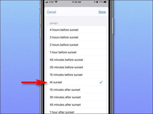 Στο επόμενο μενού, μπορείτε να επιλέξετε ένα χρονικό αντίθετο, όπως "30 λεπτά πριν το ηλιοβασίλεμα" ή "κατά το ηλιοβασίλεμα". Το ίδιο ισχύει και για τις επιλογές ανατολής. Επιλέξτε την προτιμώμενη επιλογή σας και, στη συνέχεια, πατήστε "Έγινε".