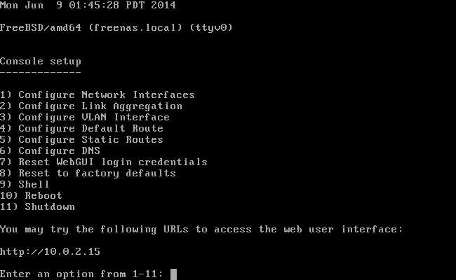 Θα δείτε την οθόνη ρύθμισης της Κονσόλας μετά την εκκίνηση του υπολογιστή σας. Μπορείτε να τροποποιήσετε τις ρυθμίσεις από εδώ, αλλά δεν χρειάζεται. Εντοπίστε το URL στο κάτω μέρος της οθόνης και συνδέστε το σε ένα πρόγραμμα περιήγησης ιστού σε άλλον υπολογιστή για να αποκτήσετε πρόσβαση στη γραφική διεπαφή του FreeNAS.