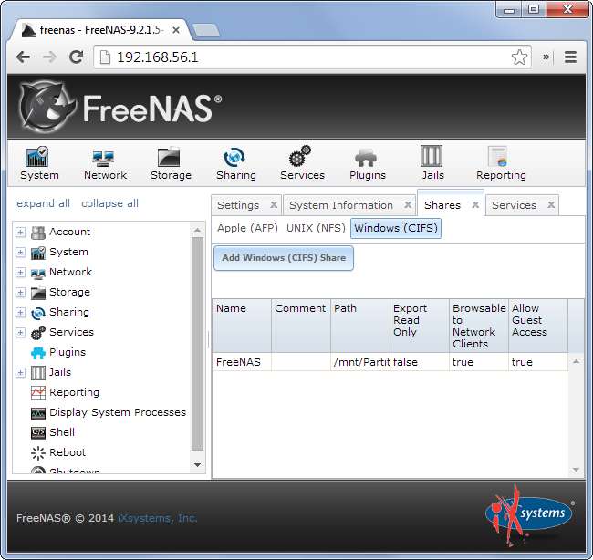Τώρα θα θέλετε να επισκεφθείτε το παράθυρο Κοινή χρήση, ώστε να μπορείτε να κάνετε τον νέο όγκο αποθηκευτικού χώρου προσβάσιμο μέσω του δικτύου. Διαφορετικά λειτουργικά συστήματα υποστηρίζουν διαφορετικά πρωτόκολλα, επομένως το FreeNAS σάς επιτρέπει να ρυθμίσετε κοινές χρήσεις Windows (CIFS), Unix / Linux (NFS) ή Apple (AFP).