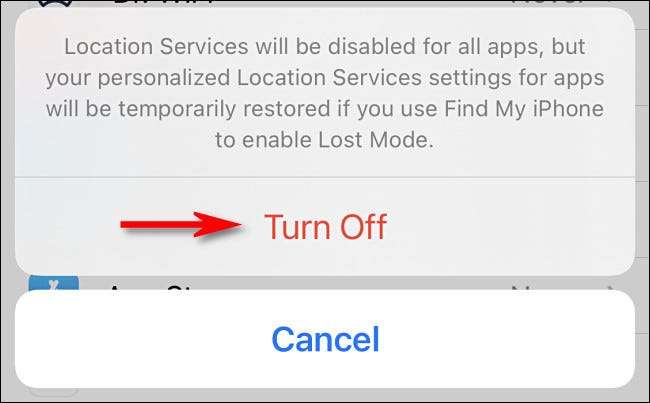 Μόλις γυρίσετε το διακόπτη, θα δείτε μια προειδοποίηση αναδυόμενων αναδυόμενων. Σας υπενθυμίζει ότι οι υπηρεσίες τοποθεσίας μπορούν να ενεργοποιηθούν εξ αποστάσεως εάν το iPhone σας τοποθετείται σε Λειτουργία απώλειας χρησιμοποιώντας το Βρείτε το iPhone μου υπηρεσία. Πατήστε "Απενεργοποίηση".