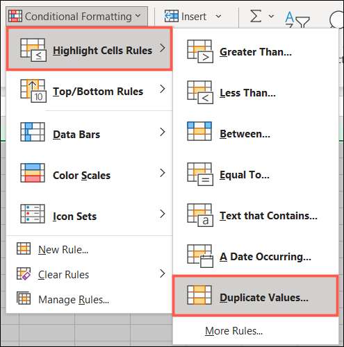 Πηγαίνετε στην καρτέλα Αρχική σελίδα και στο τμήμα στυλ της κορδέλας. Κάντε κλικ στην επιλογή "Μορφοποίηση υπό όρους", μετακίνηση σε "Επισημάνετε τους κανόνες κυττάρων", και επιλέξτε "διπλές τιμές" στο μενού Pop-out.
