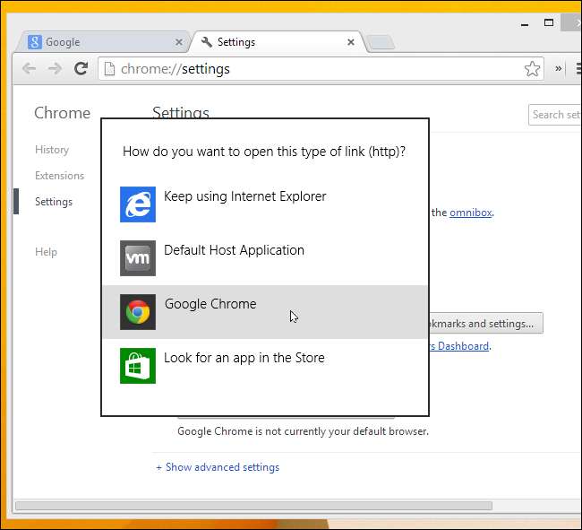 Το πρώτο πράγμα που πρέπει να κάνετε είναι να ορίσετε το Chrome ως το προεπιλεγμένο πρόγραμμα περιήγησης ιστού. Μόνο το προεπιλεγμένο πρόγραμμα περιήγησης ιστού μπορεί να λειτουργήσει στο νέο περιβάλλον εφαρμογών των Windows 8. Για να ορίσετε το Chrome το προεπιλεγμένο πρόγραμμα περιήγησης ιστού, κάντε κλικ στο κουμπί μενού του Chrome, επιλέξτε Ρυθμίσεις και κάντε κλικ στο κουμπί Ορισμός του Google Chrome ως προεπιλεγμένο πρόγραμμα περιήγησης στην ενότητα Προεπιλεγμένο πρόγραμμα περιήγησης.