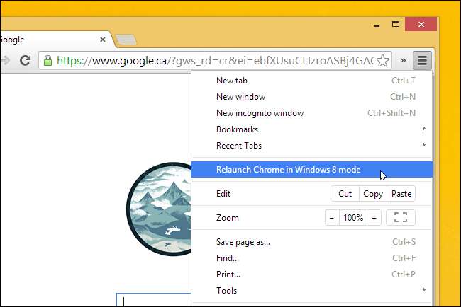 Τώρα μπορείτε να αποκτήσετε πρόσβαση στη νέα επιφάνεια εργασίας Chrome κάνοντας κλικ στο κουμπί μενού του Chrome και επιλέγοντας Επανεκκίνηση του Chrome σε λειτουργία Windows 8.